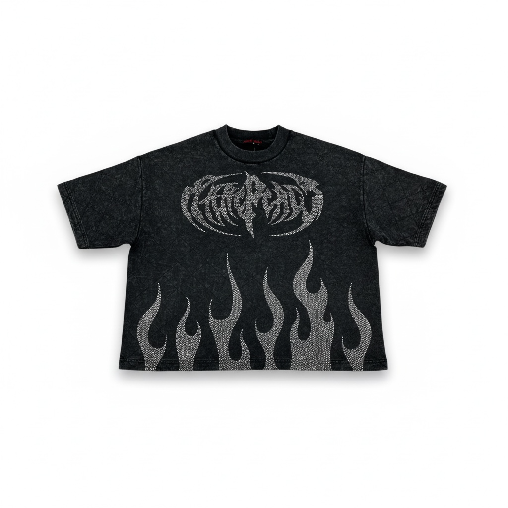 Rare Peace 'Metal Flames' Oversized Rhinestone Cropped Stud T-Shirt (Black) RT5048