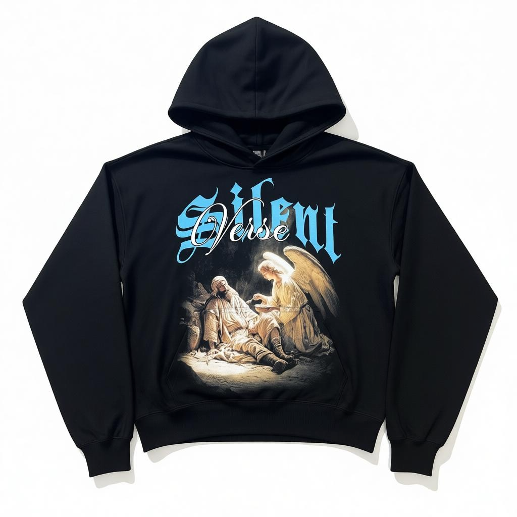Perfect for shoppers searching for a heavyweight hoodie, French terry pullover hoodie, or modern casual graphic hoodie, the Silent Verse ‘Raised By An Angel’ Hoodie combines comfort, quality, and contemporary design.