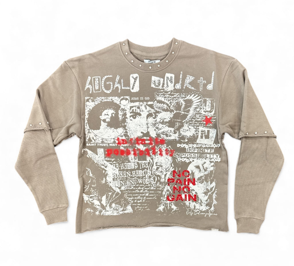 Upgrade your streetwear rotation with the Highly Undrtd “No Pain No Gain” Long Sleeve Thermal Rhinestone Cropped T-Shirt in Chocolate (Style HF5507). Designed with a cropped fit and thermal long sleeves, this men’s streetwear long sleeve t-shirt combines bold fashion with everyday wearability.