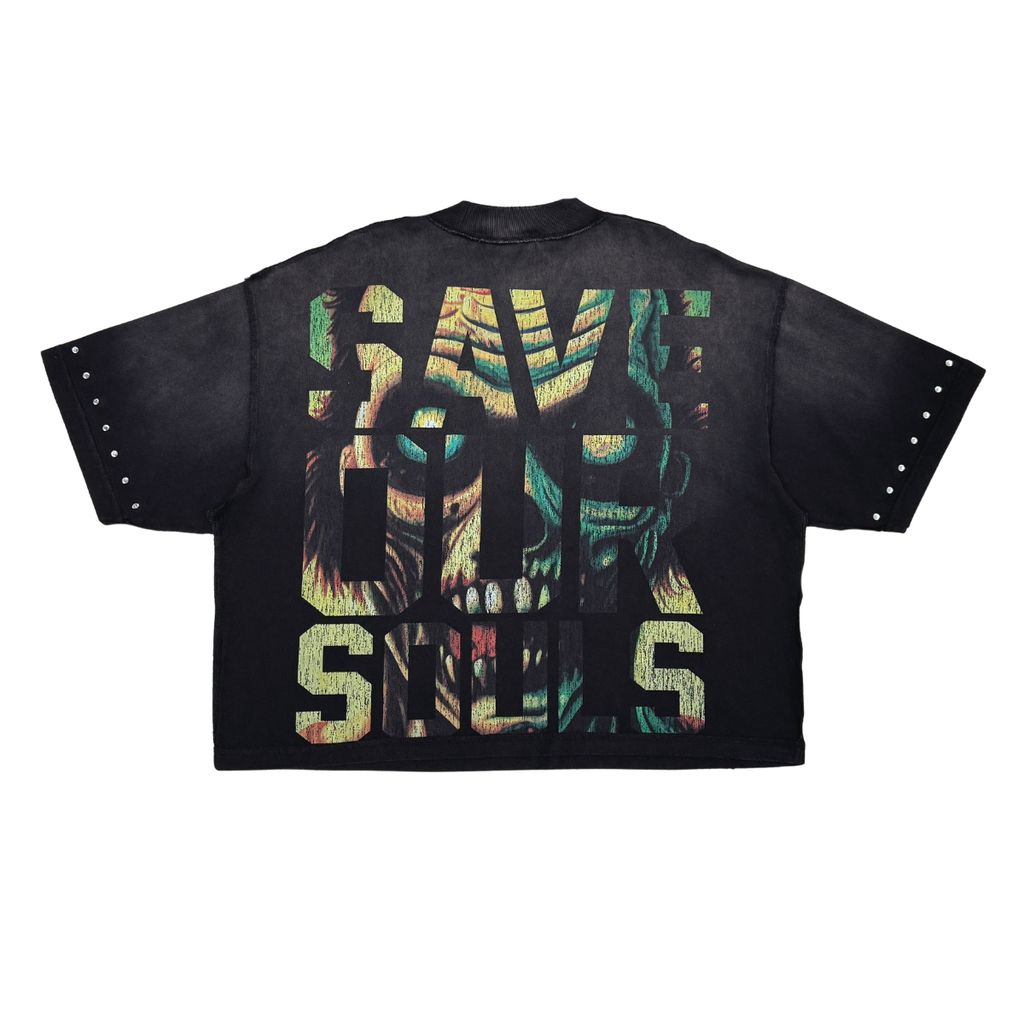 Rare Peace “No Longer Human (Zombie)” Oversized Rhinestone Cropped T-Shirt (Black) – Style RT5059