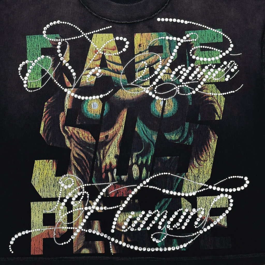 The “No Longer Human (Zombie)” graphic hits with edgy, apocalyptic energy — brought to life through reflective rhinestones that elevate the design beyond ordinary printed tees. If you’re looking for a fashion-forward black cropped streetwear top with bold character, this Rare Peace RT5059 piece is built for statement outfits.